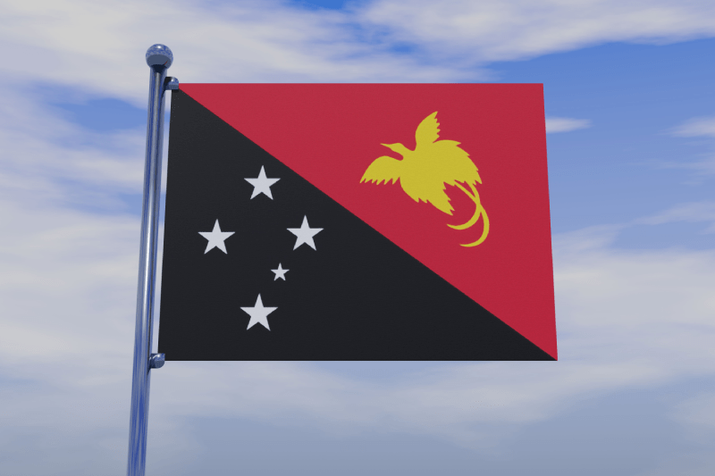 Papua Yeni Gine bayrağı, diyagonal olarak bölünmüş kırmızı ve siyah alanlardan oluşur. Kırmızı bölümün içinde sarı bir “Raggiana Cennet Kuşu” silueti yer alır. Bu kuş, ülkenin en ikonik yaban hayatı unsurlarından biridir ve yerel kabilelerin geleneksel kıyafetlerinde kullandıkları tüyleriyle kültürel bir öneme sahiptir. Cennet kuşu, özgürlüğü ve ulusal birliği simgelerken, bayrağın diğer yarısındaki “Güney Haçı” takımyıldızı ise ülkenin güney yarımküredeki konumuna işaret eder. Bu tasarım, ülkenin vahşi doğası ile mistik geleneklerinin bayrak üzerindeki muazzam bir birleşimidir.